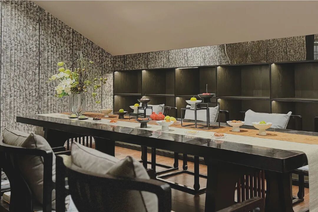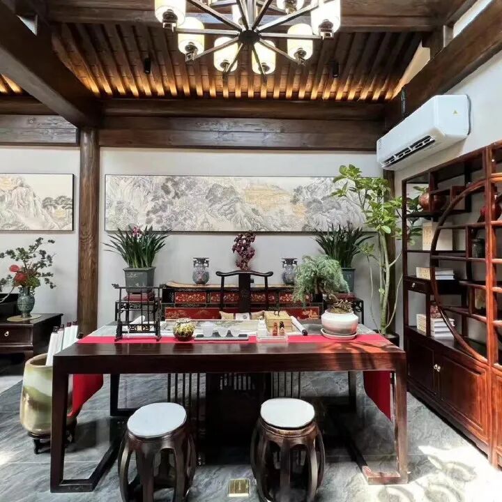 家具方面,深色木质沙发、椅子、长桌构成了室内的主要陈设。这些家具设计简洁而典雅,既体现了传统中式家具的韵味,又融入了现代的设计理念。长桌上摆放着精致的茶具和绿植,显示出主人雅致的生活态度和对自然的热爱。