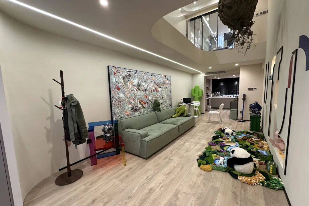 绿色沙发与玩偶、手办的巧妙点缀,为节日氛围增添了一抹童趣与活力,使得整个空间既现代又不失温馨。