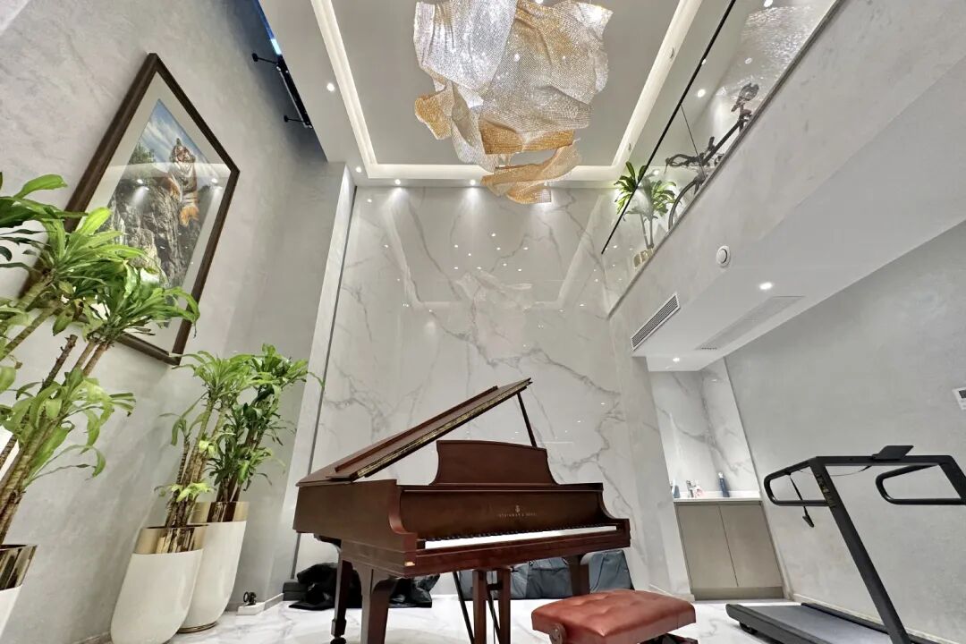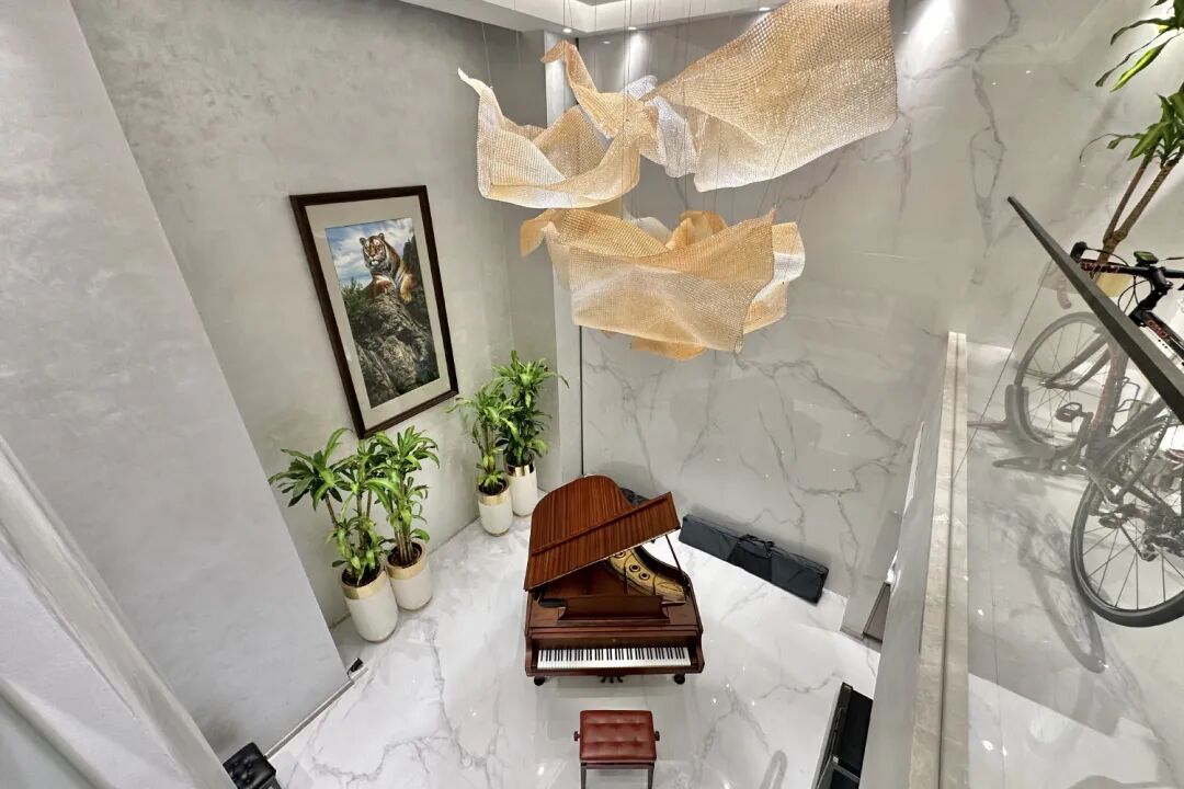 在这其中,钢琴的优雅与绿植的生机盎然相互辉映,再搭配上大理石纹理的墙面,使得整个居住空间显得舒适无比。