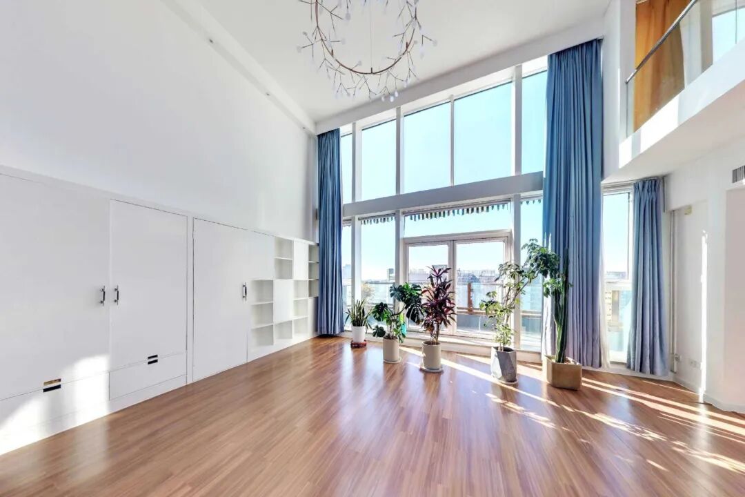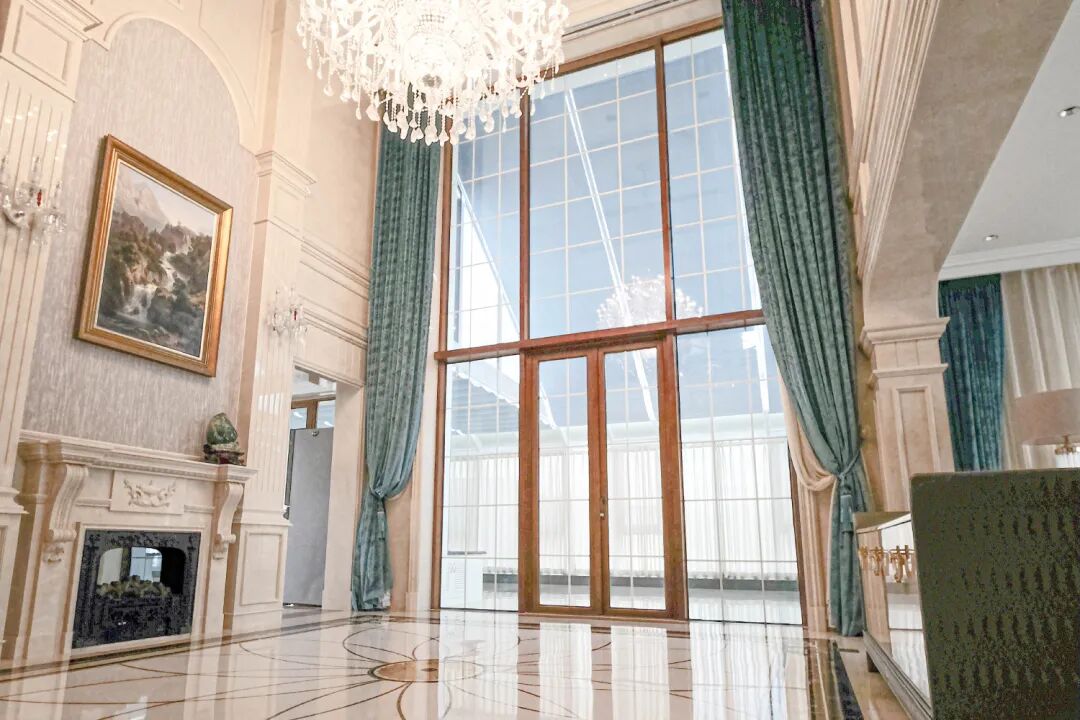 高挑的空间通过大面积的落地窗引入自然光线,与典雅的绿色窗帘交织,营造出一种既舒适又优雅的居住体验。