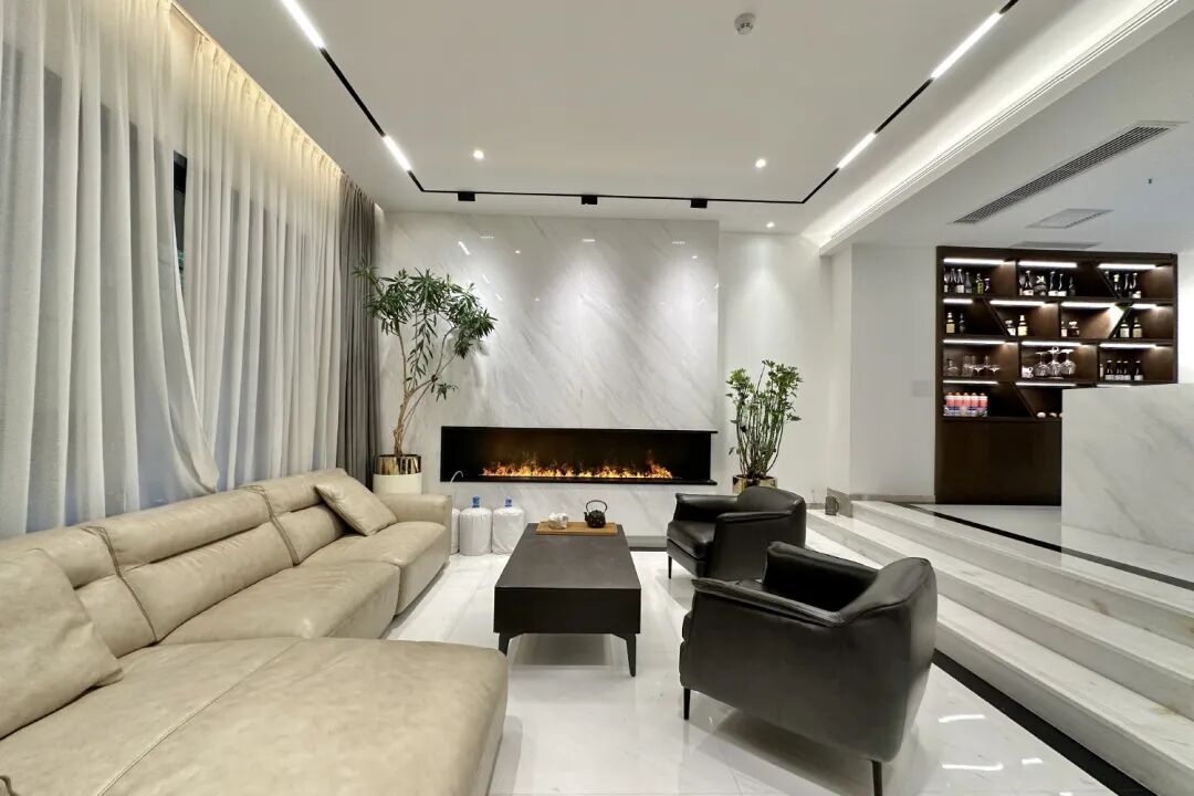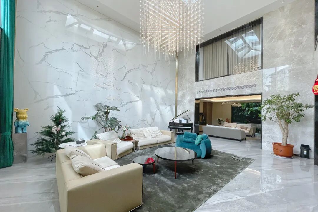在圣诞节期间,别墅的挑空设计带来了独特的居住感受。高挑的天花板与精致的吊灯在圣诞灯光的点缀下相互映衬,使得整个空间显得尤为温馨。