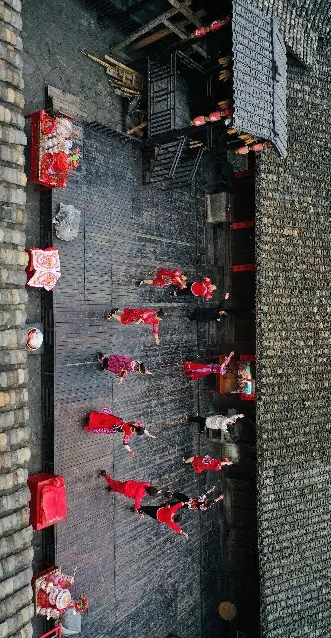 “龙灯舞”有大蠕龙、火龙等十个品种,尤以大蠕龙最有特色。以彩绘纸黏糊龙身,有骨有“肉”,头尾摆动灵活。龙长50多米,24栋龙身,寓意24个农事季节,表演张弛有度、高潮迭起;“彩灯舞”主要包括鱼跃龙门、泥鳅吃汤圆等十二个品种。龙舞场面恢弘,氛围热闹。“红灯万盏人千叠,一片缠绵摆手歌。”清代诗人彭施铎描绘了土家族人民祭祀祖先、庆祝丰收时的盛景。土家族摆手舞,是重庆酉阳土家族苗族自治县传统舞蹈,起源可追溯到上古时代的巴人活动时期,盛行于明清,2008年成为国家级非遗。
