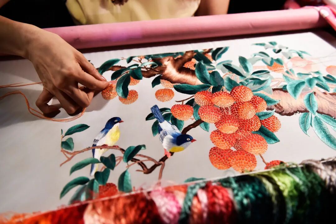 一尺绢上,穿针引线,富丽堂皇的绣品翩然现世。广绣源于唐代,由中原移民将刺绣带入岭南,成为闺阁之技。其为广州及其古属地南海、番禺、顺德等地的民间刺绣工艺,刺绣织物精美繁复,一针一线足见功底。尤以色彩艳丽著称,热情奔放。所用材料除了丝线、绒线外,还创造性地使用孔雀毛、马尾作等线缕。广绣是中国四大名绣之一,2006年列入国家级非遗名录。▲ 广绣。供图/董乃德