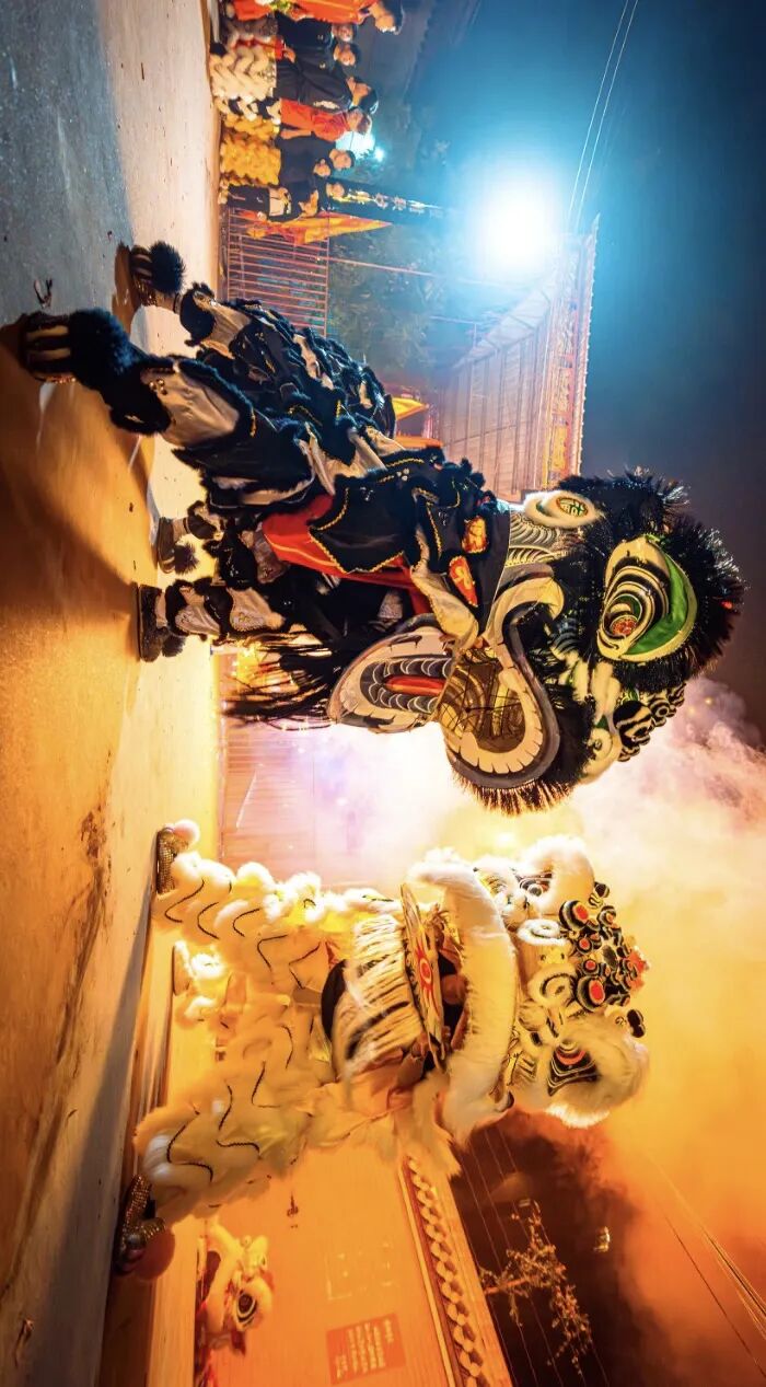 广东醒狮,国家级非遗,融武术、舞蹈、音乐等为一体。分文狮、武狮和少狮三大类。文狮温顺而和善,武狮勇猛而刚烈,少狮即幼狮,憨态可爱,一般跟随文、武狮同场表演。醒狮被认为是驱邪避害的瑞兽,寄托了老百姓祈望吉祥平安的美好心愿。每逢节庆或有重大活动,必有醒狮助兴。醒狮所用狮头造型独特,以神兽狻猊为原型,头顶尖角、绘云头如意纹及火纹,取驱邪避害之意;色彩借鉴传统戏曲中三国人物脸谱,黄刘备、红关羽、黑张飞、青赵云、蓝马超、橘黄忠,表达对中华英雄人物及其忠正仁义民族精神的崇敬之意。不同场合采用狮头也不同,开业庆典用关公狮和刘备狮,醒狮比赛用张飞狮,祝寿用黄忠狮,丧事则用马超狮。 ▲ 狮舞表演。供图/全景视觉(上),陈烁明(下)