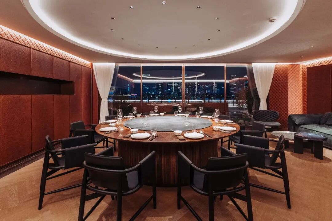 红绿主色调的餐厅空间点缀绚丽的蓝色灯光,传统中式与现代摩登结合的用餐环境为食客带来精致美味体验。7间大小区分的精致包房,可以容纳3-20人不等,小型聚餐和宴请都有私密舒适的体验。