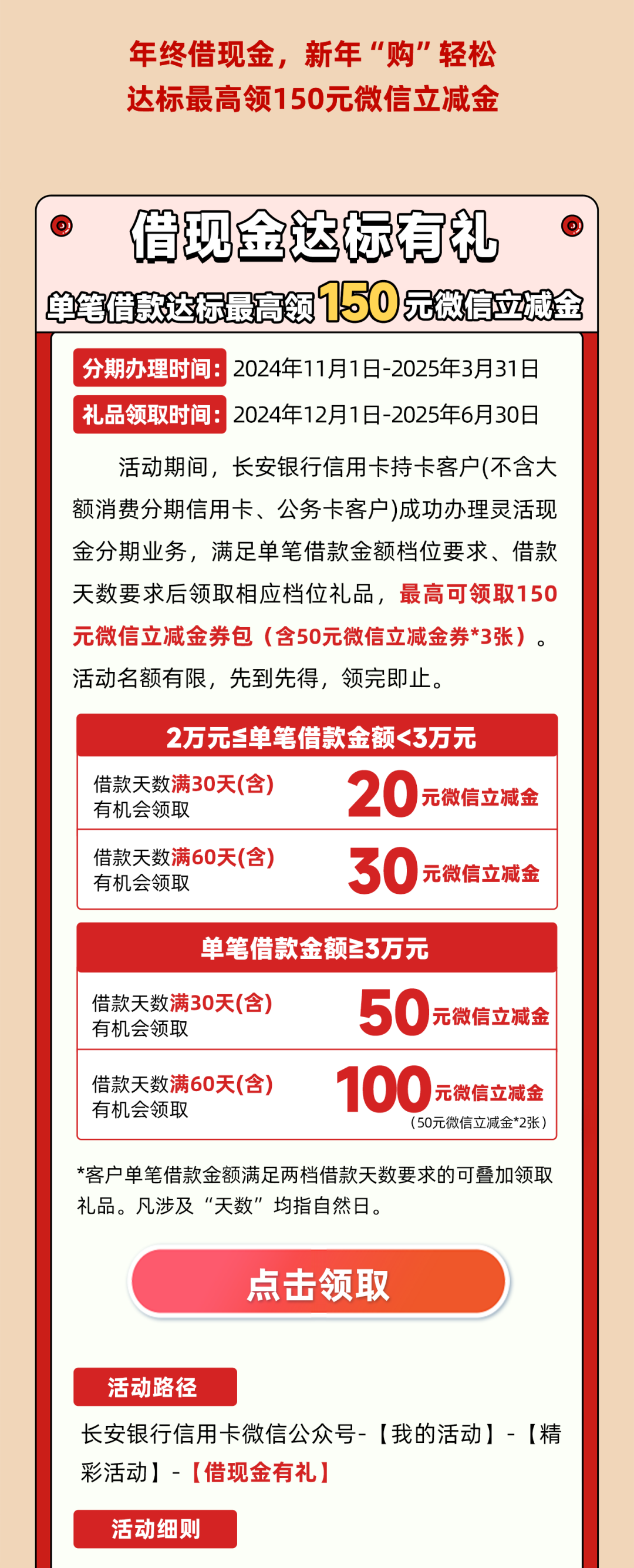 (二)客户在活动期间符合达标条件(分期金额及借款天数满足相应档位)后,可于达标次日通过长安银行信用卡微信公众号-我的活动-精彩活动-“借现金有礼”页面领取微信立减金,截止领取时间后未领取视为放弃,不再单独通知。活动中凡涉及“日”及“天数”均指自然日。