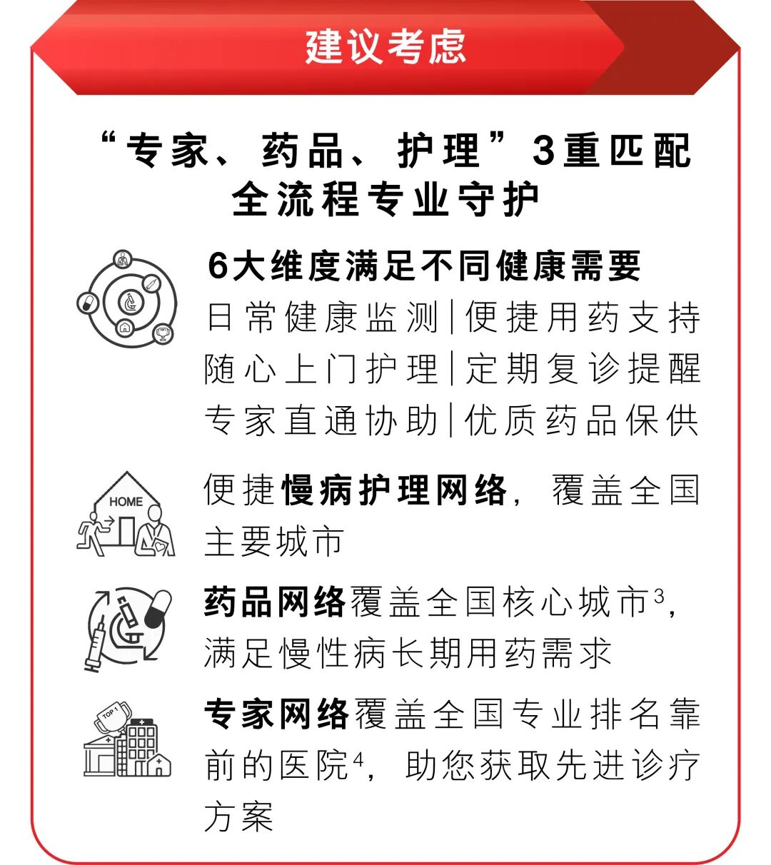 「汇丰·汇健康」专属服务计划,依托汇丰集团网络资源,联手知名药企1、医疗和健康管理机构,2025年加码慢病管理,“主动性+全流程 2”规划健康,助您和家人达成健康心愿。