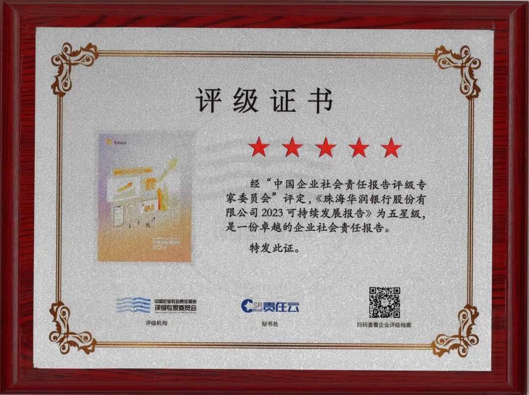 今年8月,华润银行继连续十年发布《社会责任报告》后,正式发布首本《2023年可持续发展报告》,并连续第六年获“中国企业社会责任报告评级专家委员会”五星级(卓越)评价。