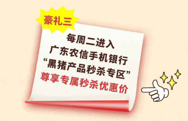活动期间,佛山地区用户,每周二进入广东农信手机银行“喜农纪黑猪产品秒杀专区”,可享秒杀优惠价!数量有限,先到先得!