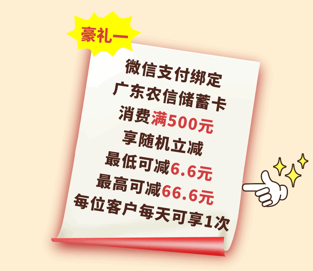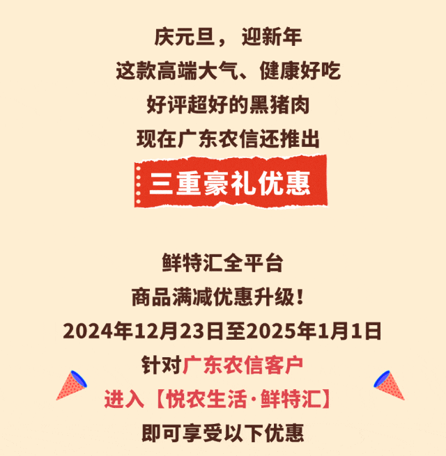 活动期间,用户在鲜特汇商城购买喜农纪黑猪产品,通过微信支付绑定广东农信储蓄卡支付订单,消费满500元享随机立减6.6-66.6元。