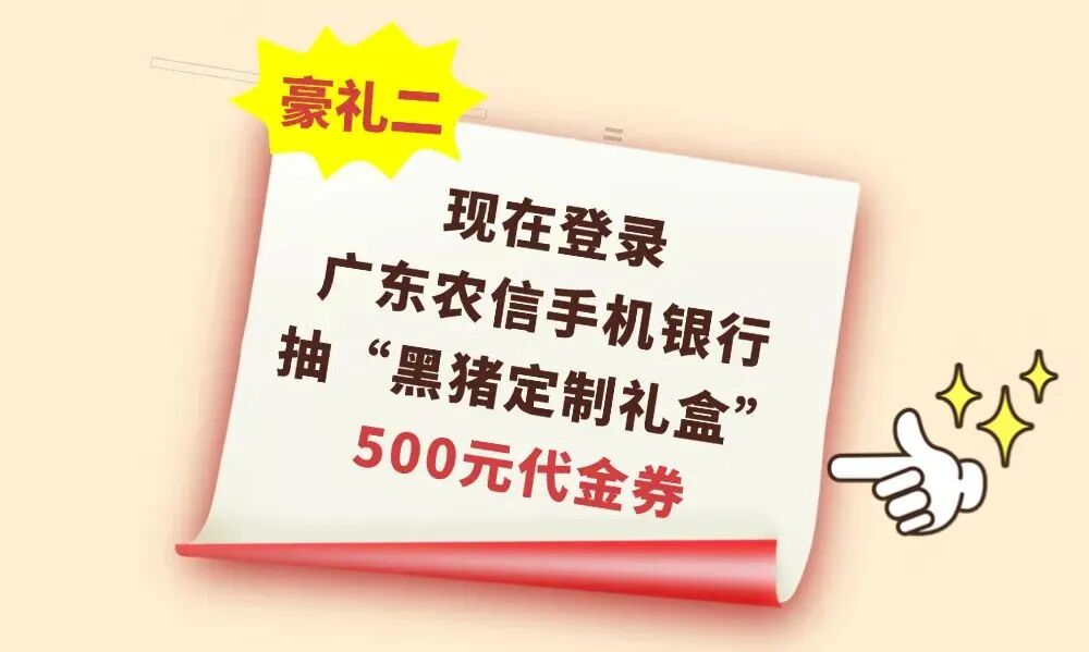 即日起,佛山农商行客户每天登录广东农信手机银行可获得1次抽奖机会,有机会抽中“喜农纪黑猪定制礼盒”500元代金券!