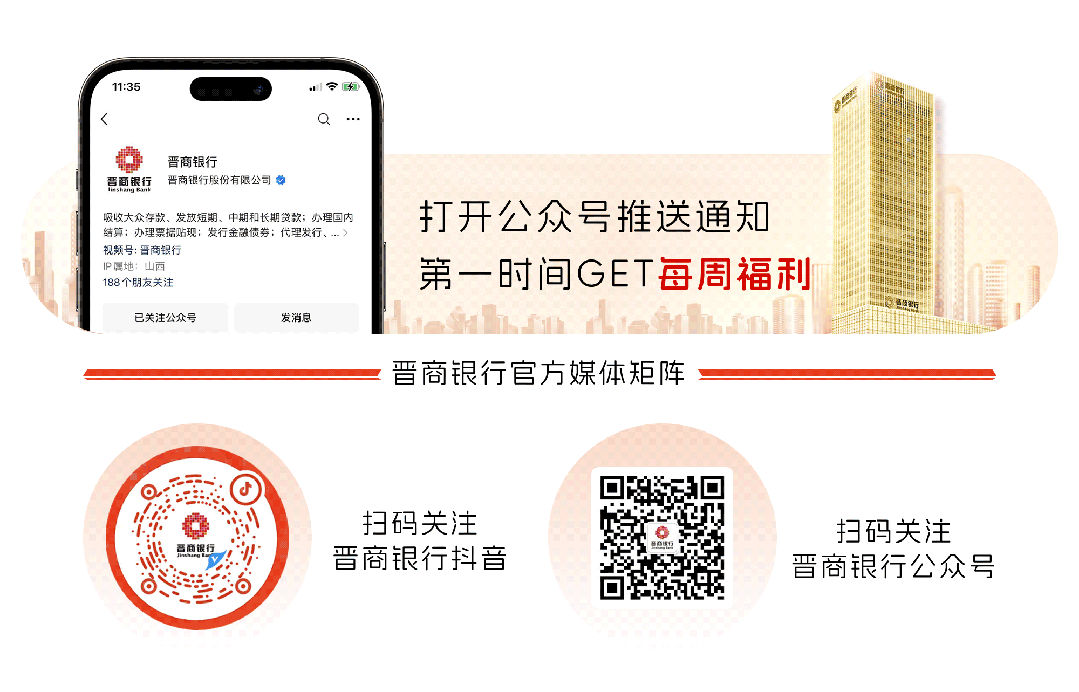 文章内容来源于公众号:晋商银行,点此可查看原文,内容版权归相关企业所有,本网站仅供交流学习。若涉及版权问题或存在侵权情况,请及时与我们联系,我们将第一时间进行删除处理。