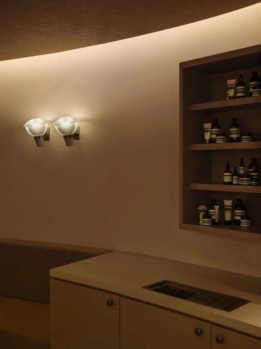 ● Aesop 伊索北京三里屯太古里店,圆弧形的中央水槽被楼梯温柔环抱,宛如对顾客发出的一次邀请