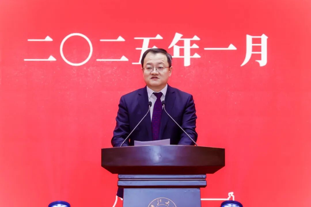 杜江峰在主持时表示,过去一年,全校上下凝心聚力、砥砺奋进,各项事业保持蓬勃发展的强劲动能,奋力谱写了学校高质量发展的新篇章,为学校在中国特色世界一流大学建设中继续走在前列奠定了坚实基础。2025年是学校高质量收官“十四五”、高水平谋划“十五五”的关键一年,要增强育人动能,全面汇聚人才培养要素,深化以学生成长为中心的育人体系构建;要增添创新势能,全面围绕国家战略需求,建设世界一流中国特色浙大风格的自主知识体系;要增长开放效能,全面提升创新策源能力,提升全球视野办学格局。大家要在高远使命的引领下始终保持开拓创新、奋发有为的精神风貌,加快建设世界一流大学和优秀学科,在新征程中勇立潮头、行稳致远,迈向更加美好的明天。