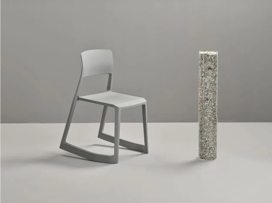 作为与瑞士制造商微达公司联袂开发的杰作,这款椅子生动诠释了瑞士设计史不仅有革新性设计师的参与,也有杰出制造商的联袂合作。椅子旁的物品即生产该家具用的塑料颗粒。再生椅的灰色椅身是回收材料的本色,上面自带的微小色斑,更增添了椅面的立体感与生趣。