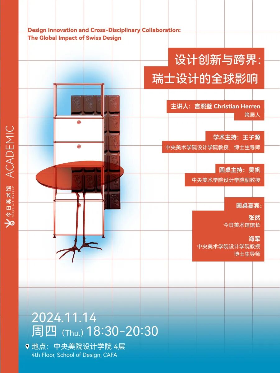 今日美术馆联合中央美术学院设计学院,围绕展览的内容,特别策划“设计创新与跨界:瑞士设计的全球影响”为题的讲座,邀请策展人言照壁(Christian Herren)进行主题分享,中央美术学院教授王子源担任本次讲座的学术主持,并邀请今日美术馆馆长张然,中央美术学院教授海军,中央美术学院副教授吴帆进行圆桌讨论,对瑞中设计展开分享。