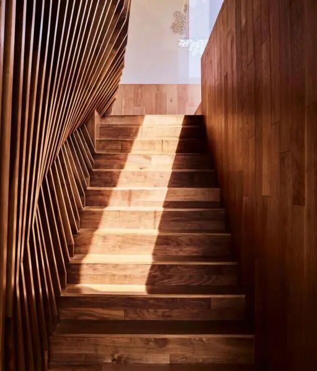 采用橡木手工打造的楼梯是根据让的精选图纸,通过算法计算出最优化的曲线。这也致敬了马塞尔·杜尚Duchamp的《裸体下楼梯,第 2 号》(Nude Descending a Staircase, No. 2)。