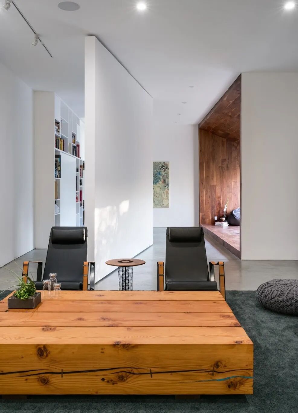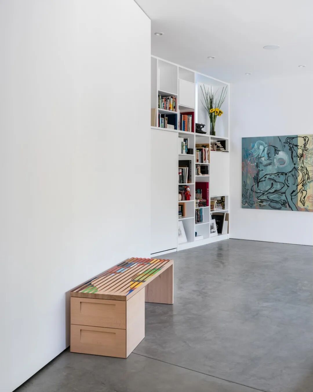 2015年,简明委托洛杉矶建筑师Dan Brunn对空间进行了改造。有趣的是,Brunn与盖里最初的设计意图不谋而合,并用自己的语言诠释出来。Brunn从简明的画作中交织的曲线笔触汲取灵感,并将其与盖里标志性的几何设计融合在一起。在材料的使用上,Brunn延续了盖里70年代的风格特点,大量采用了实木、混凝土和玻璃。