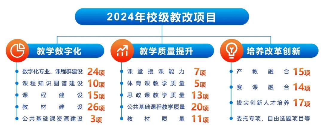 大力推进“课堂质量提升计划”,从课程体系建设、优质教学资源建设、数字化教学改革、课堂质量评价等方面全方位提高课堂教学实效,夯实高质量人才培养基石。以新一轮本科人才培养方案修订为契机,构建“通融专跨”四位一体课程体系,鼓励每个专业推出微专业课程,以项目制课程体系丰富学科跨学科基础知识;打造优质课程资源,开展一流本科课程(智慧课程)建设试点,引导教师运用知识图谱、AI助教等数字化技术助学助教,以点带面推进人才培养数智化转型,新增获批认定第二批省级一流本科课程24门,设立校级智慧课程15门、虚拟仿真实验教学课程8门;严抓课堂教学质量,建立完善“合格-优秀-卓越”三级课堂教学质量评价体系,以评促建全方位保障课堂教学实效。![]()