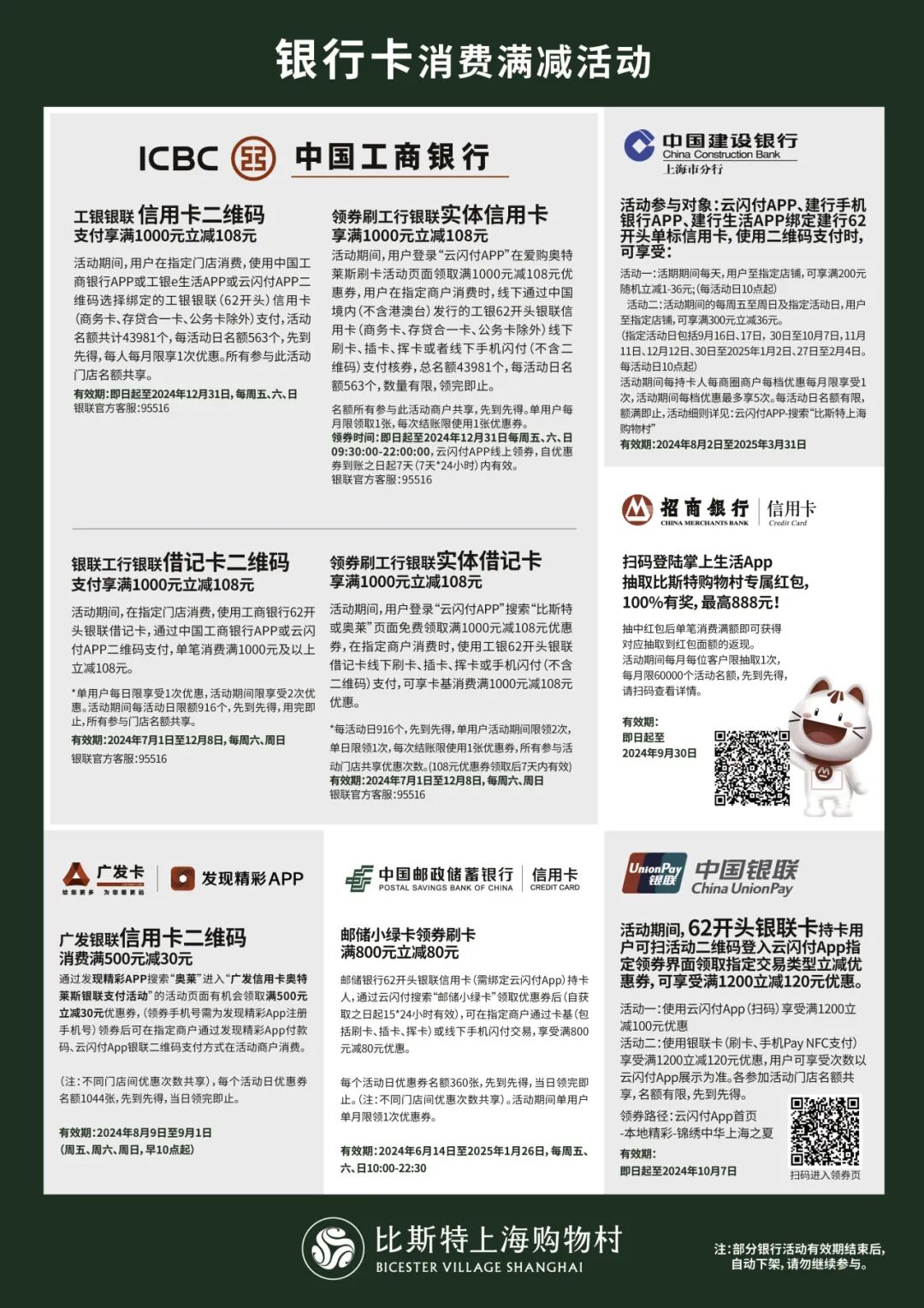 *注:银行满减活动可在购物村内指定品牌门店参与,具体请以收银台前展示的立牌为准。