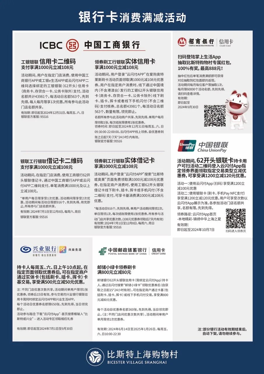 *注:银行满减活动可在购物村内指定品牌门店参与,具体请以收银台前展示的立牌为准。