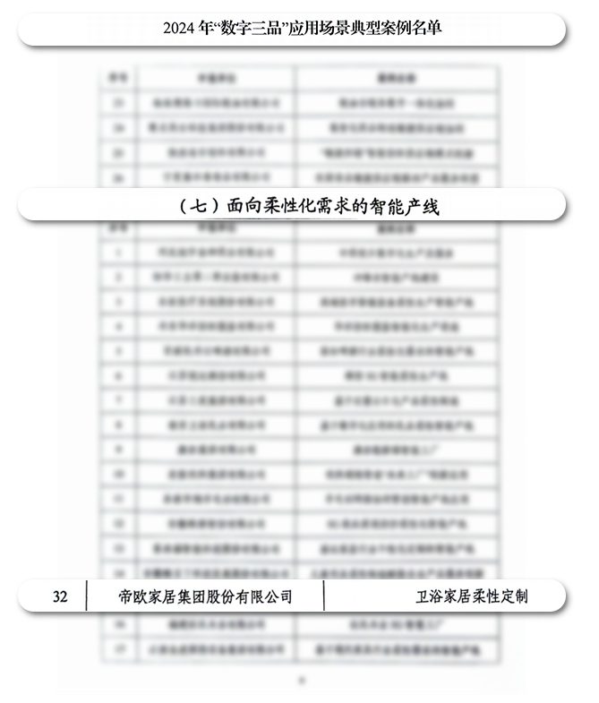 近期,工信部发布2024年数字三品应用场景案例,帝欧家居凭借“卫浴家居柔性定制”案例成功入选《面向柔性化需求的智能产线》名单。