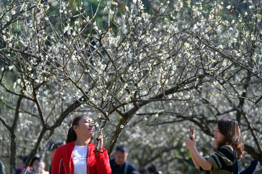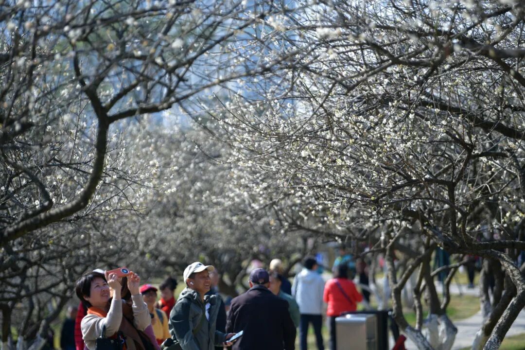 萝岗香雪公园的梅花已绽放,雪白的梅花挂在枝头上,吸引了众多市民游客前来观赏。