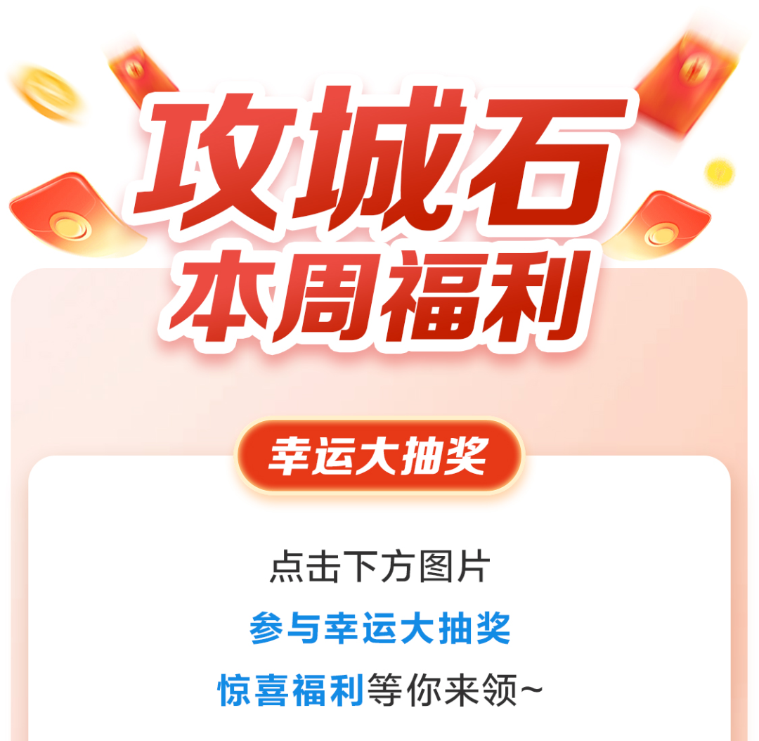 现金红包:0.3~88元微信现金红包,将通过【攻城石】公众号内发出,用户点击后即可领取,红包中的现金将到达用户的微信零钱账户 ,请注意查收。