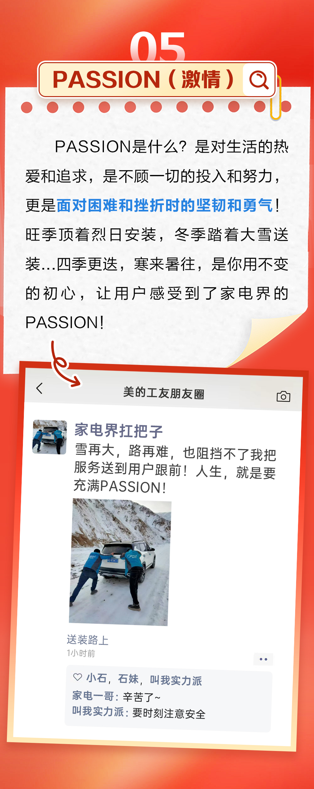 Passion 是什么?是对生活的热爱和追求,是不顾一切的投入和努力,更是面对困难和挫折时的坚韧和勇气!旺季顶着烈日安装,冬季踏着大雪送装...四季更迭,寒来暑往,是你用不变的初心,让用户感受到了家电界的Passion!