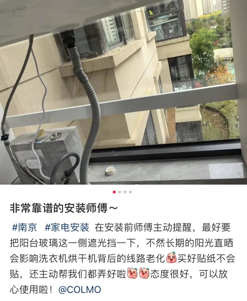 用户报装COLMO洗烘套装,严师傅接到工单后上门安装,发现用户家阳台直晒,担心水管线路被直晒后加速老化,主动提醒并帮用户贴了隔热膜。用户在小红书点赞严师傅:“我们买了贴纸但不会贴,师傅不仅主动帮我们都弄好,而且态度很好。”