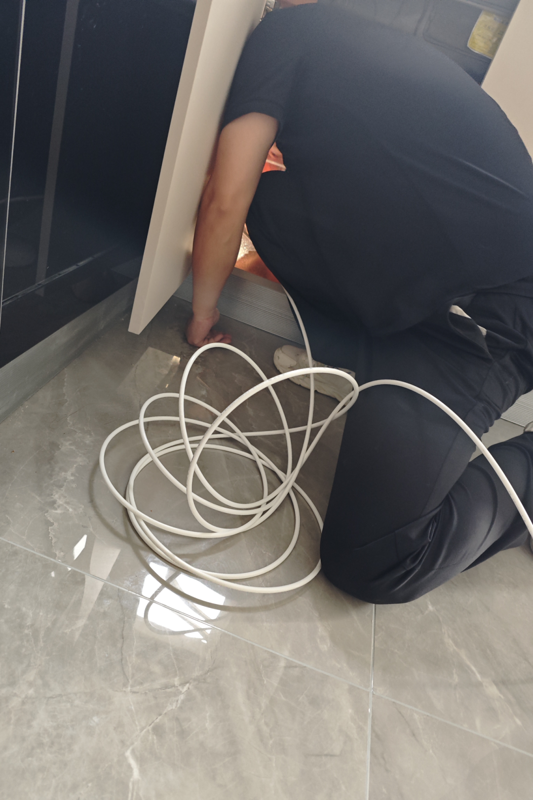 用户购买了COLMO产品,两位师傅上门安装。在与用户确认了安装位置后,师傅们发现用户家没安装插座面板,于是立即为用户预埋PE管。完成预埋后,他们又仔细检查了用户家的水路,发现洗碗池下的水管脱落,便迅速为用户重新安装好。用户对两位师傅周到且全面的服务表示很满意。