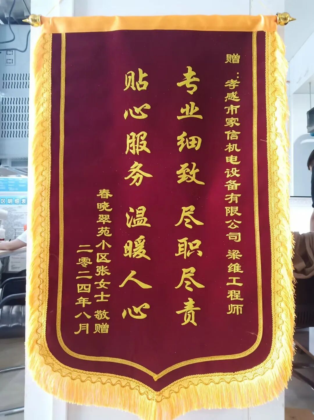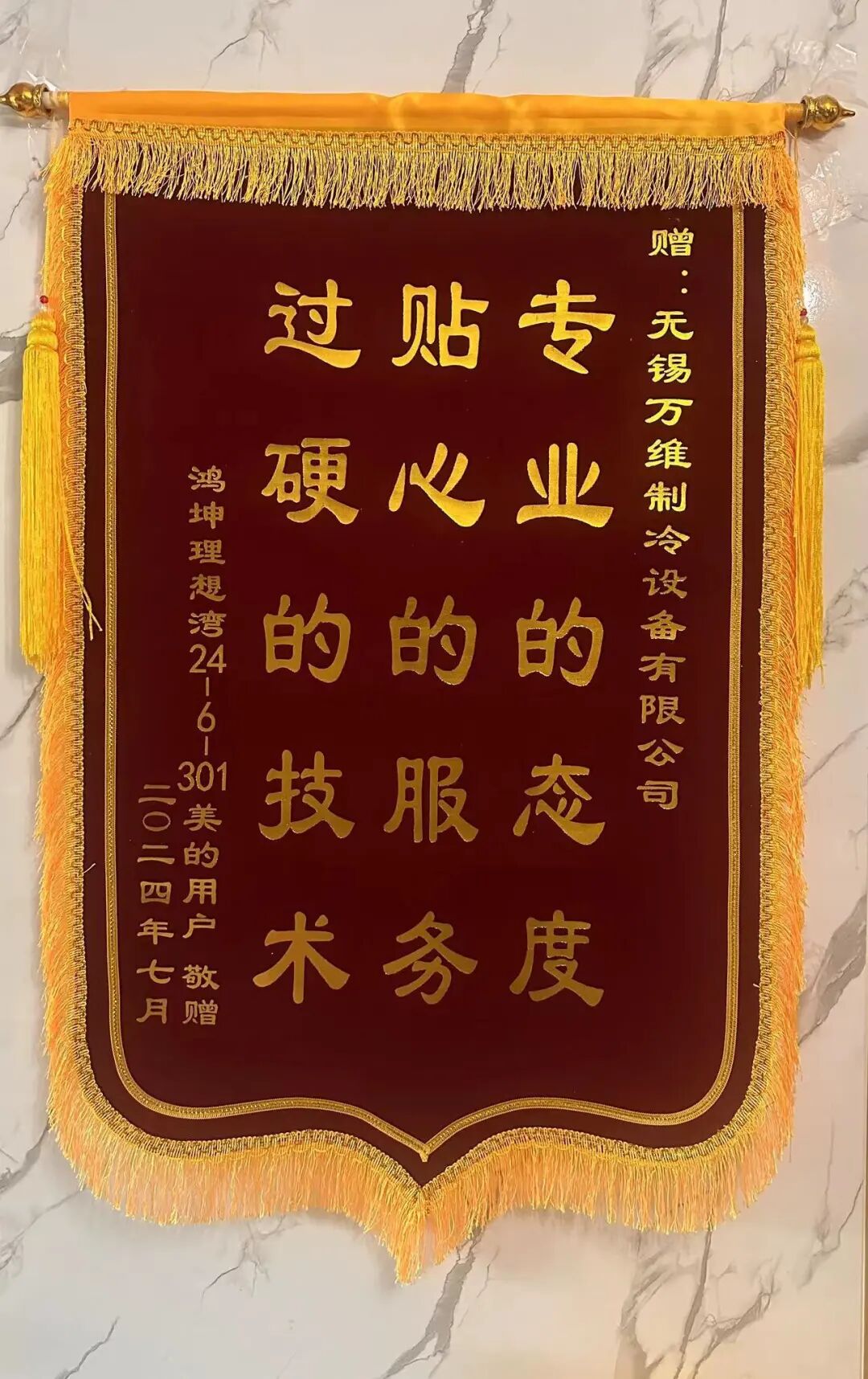 江苏朱先生因家中空调不制冷报修,雷师傅上门检查,发现是因原安装网点(已撤)的师傅在安装时疏忽,吊顶内的空调管道接口未连接到位,造成制冷剂泄漏。雷师傅与用户积极沟通后,决定在吊顶开口以修复管道。在空调正常运行半月后,他再次向网点申请特批资源,协助用户修复吊顶。最终,他在费用全免的情况下完美解决用户问题。用户对雷师傅尽责且有担当的服务十分感动,特赠锦旗以表谢意。