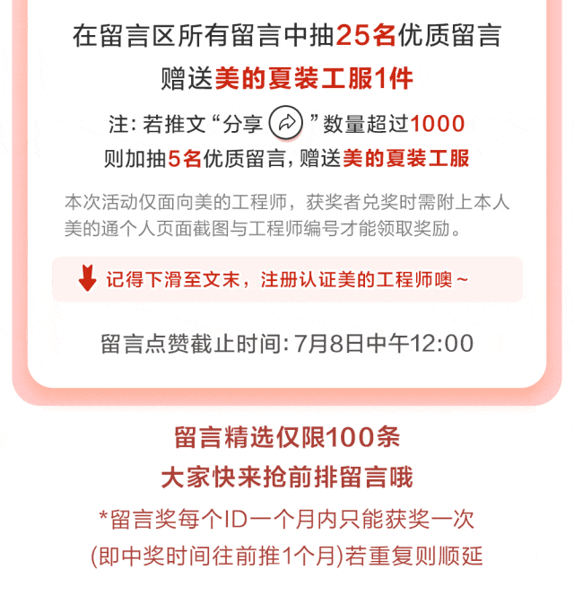 ✔ 参与留言话题,在留言区所有留言中抽取25名用心评论者送美的夏装工服;若推文"转发"数量超1000,则加抽5名优质留言送美的夏装工服!