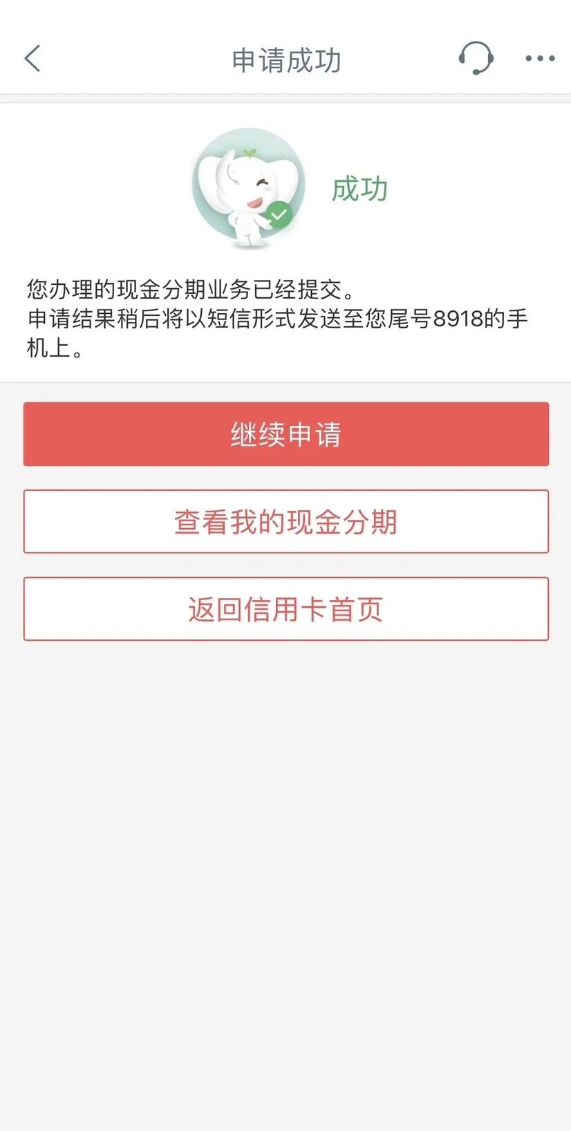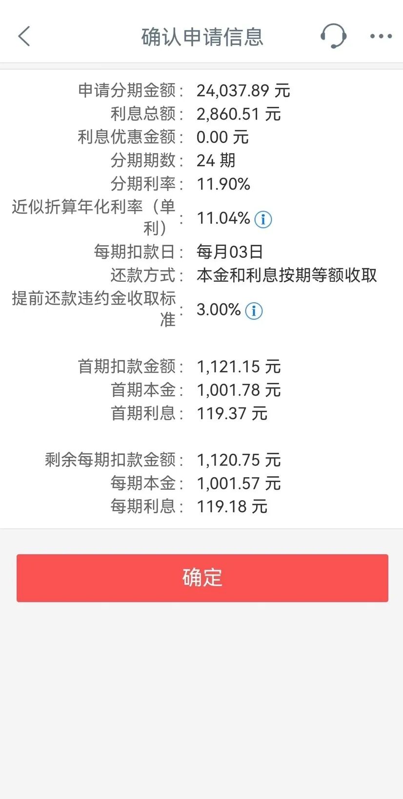 3.确认分期付款相关信息,点击“确认”,即提交现金分期申请,结果以短信形式通知。