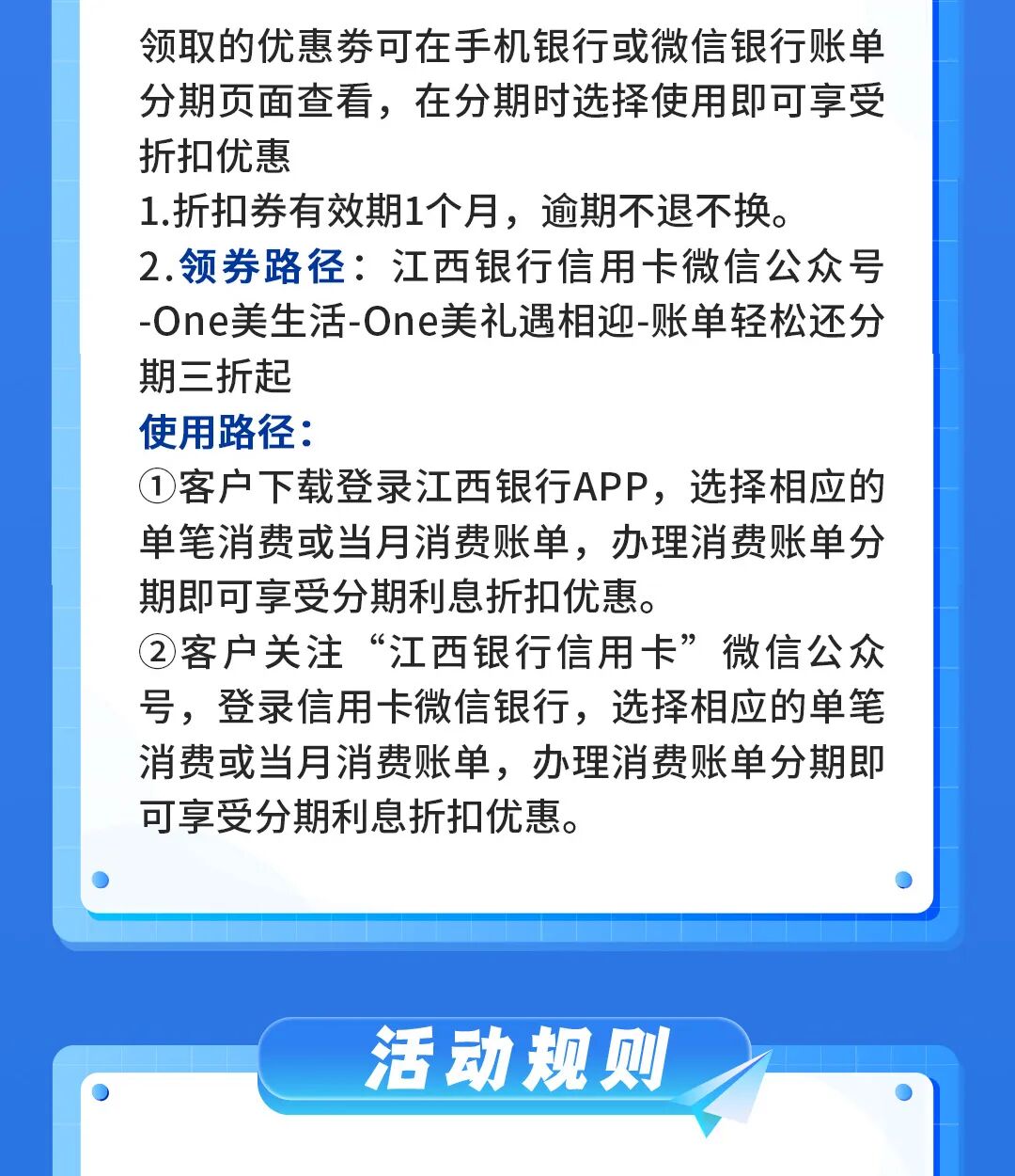 6.本次活动所有时间点以后台系统时间(北京时间)为准。如出现不可抗力或情势变更等情况(如重大灾害事件、受有权机关指令需停止或调整的、系统故障需暂停的、活动中存在违规作弊行为损害消费者权益的),在法律许可的范围内,我行保留调整、暂停和终止本活动的权利,并经江西银行信用卡微信公众号公告后生效。