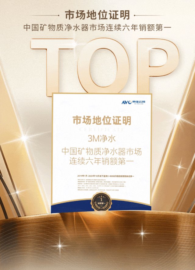 3M全屋净水更以卓越的产品和品牌实力,荣获“中国矿物质净水器市场连续六年销额第一”的市场认可!