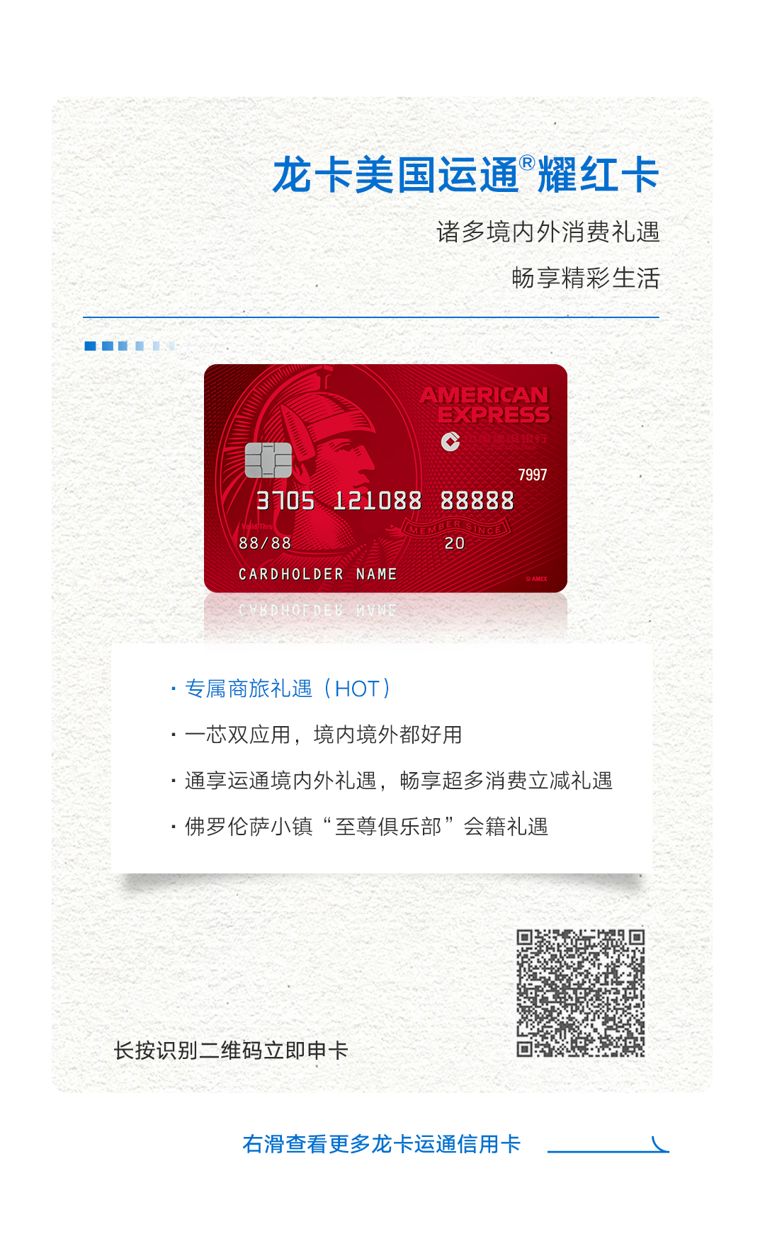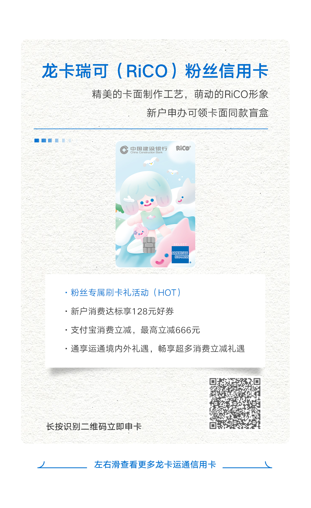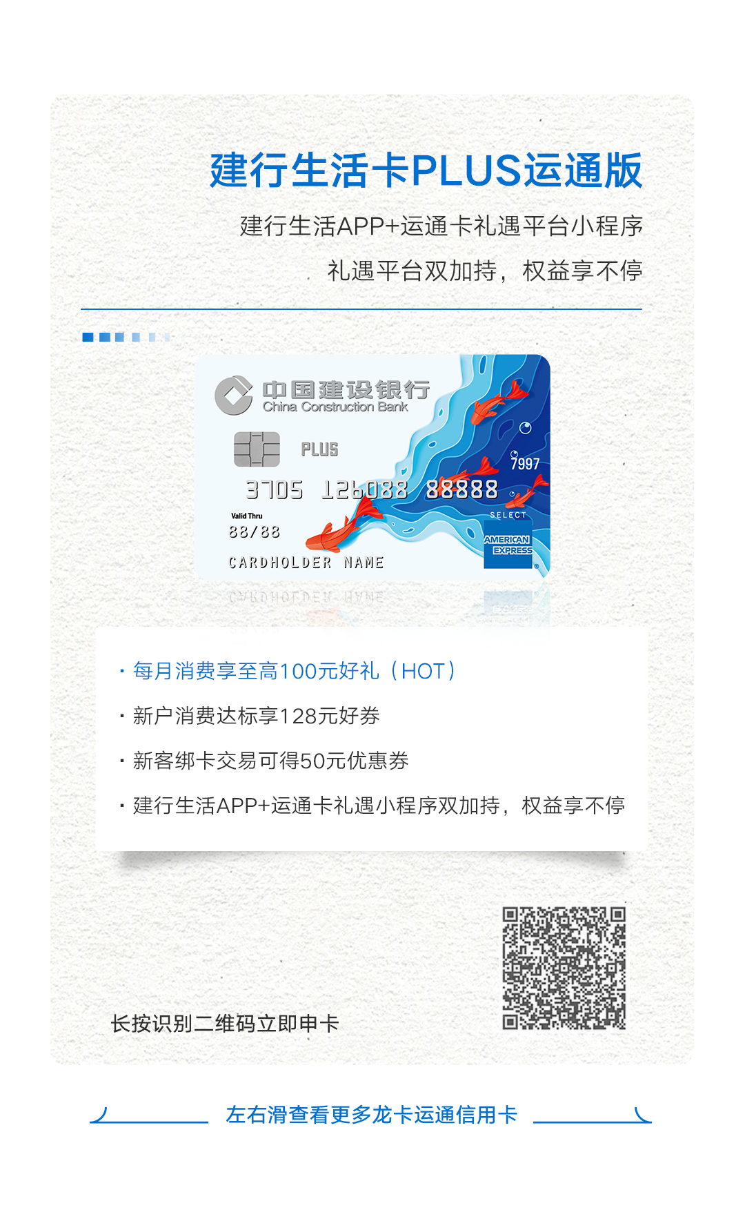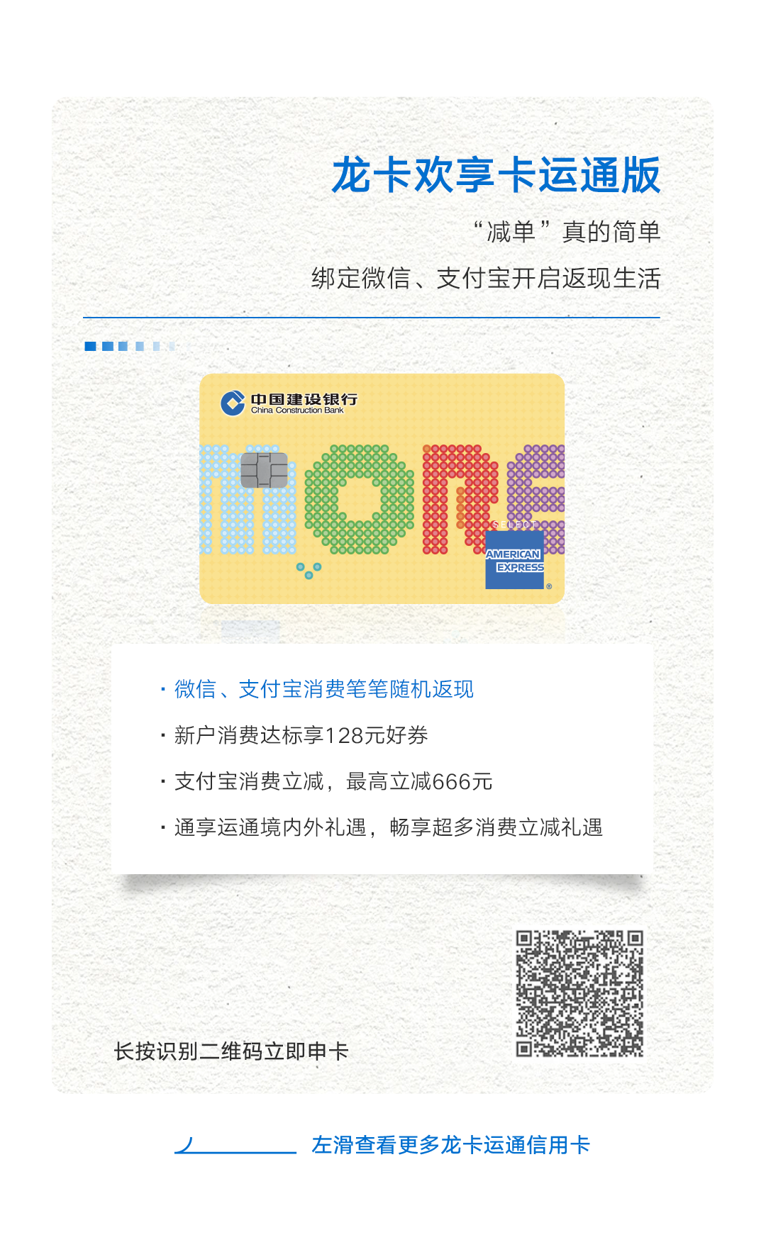 *中国建设银行仅提供信用卡支付服务,上述由运通主办的活动,活动细则以运通官方渠道告知为准,活动商品及服务由相关商户提供。