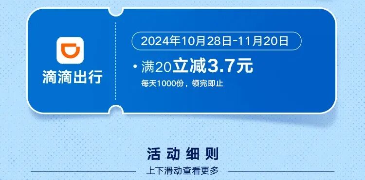 活动期间,同一持卡人仅限享受1次。本活动优惠与收银台其他优惠不可叠加。同一手机号、同一银行卡、同一证件号码、同一滴滴账号或同一终端设备,满足其中任一条件均视为同一持卡人。订单是否符合本活动优惠的条件及实际优惠金额以支付完成页面的显示信息为准。