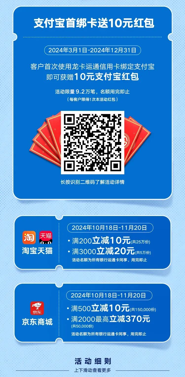活动一:活动期间,用户在手机淘宝/天猫 APP(仅限手机系统 ios 和安卓系统)上下单并勾选美国运通信用卡优惠, 且选择支付宝方式使用龙卡运通信用卡进行付款, 即有机会享单笔实付金额满 200 元立减 10 元优惠。本次活动总名额 250,000 名,活动名额为所有银行运通卡同享,用完即止。下单时请注意下单页面是否提示可使用本满减优惠,如未提示可使用本满减优惠则表明不符合参与条件或名额已使用完毕。活动期间同一用户限享 1(一)次本优惠。