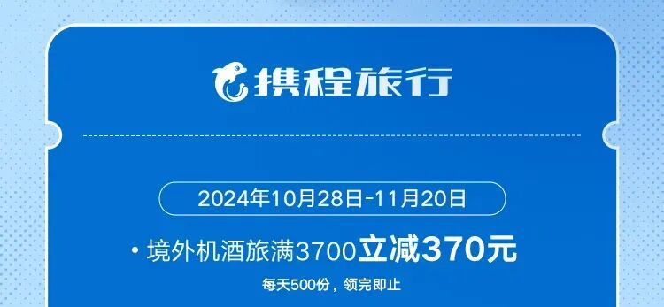 活动简介: 活动期间,持卡人在“携程旅行”APP下单预订国际机票(含港澳台地区)、海外酒店(不含港澳台地区酒店)、指定旅游线路商品时,在收银台选择“程支付”,并使用37开头的龙卡运通信用卡成功支付该订单,有机会享受“单笔订单实付满3700元立减370元”活动优惠。活动总优惠名额12000个,每日优惠名额500个,活动名额为所有银行运通卡同享,用完即止。