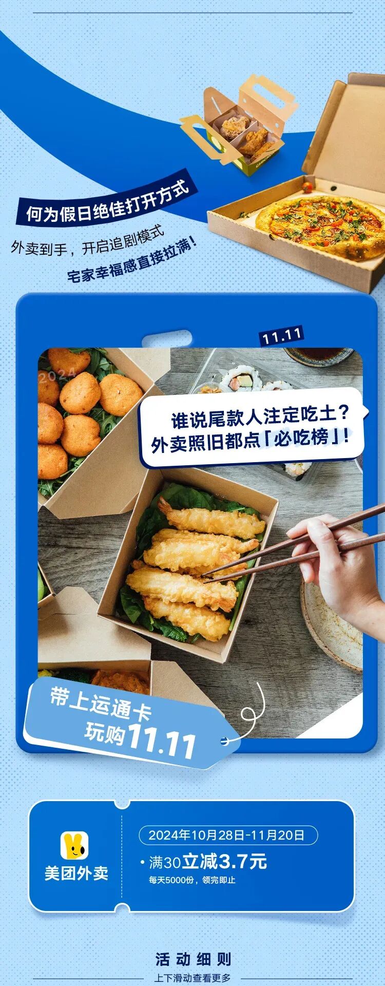 活动简介: 活动期间,持卡人在“美团”APP外卖业务板块下单,在收银台选择“美团支付”,并使用37开头的龙卡运通信用卡成功支付该订单,有机会享受“单笔订单实付满30元立减3.7元”活动优惠。活动总优惠名额12万份,每日优惠名额5000份,活动名额为所有银行运通卡同享,领完即止。