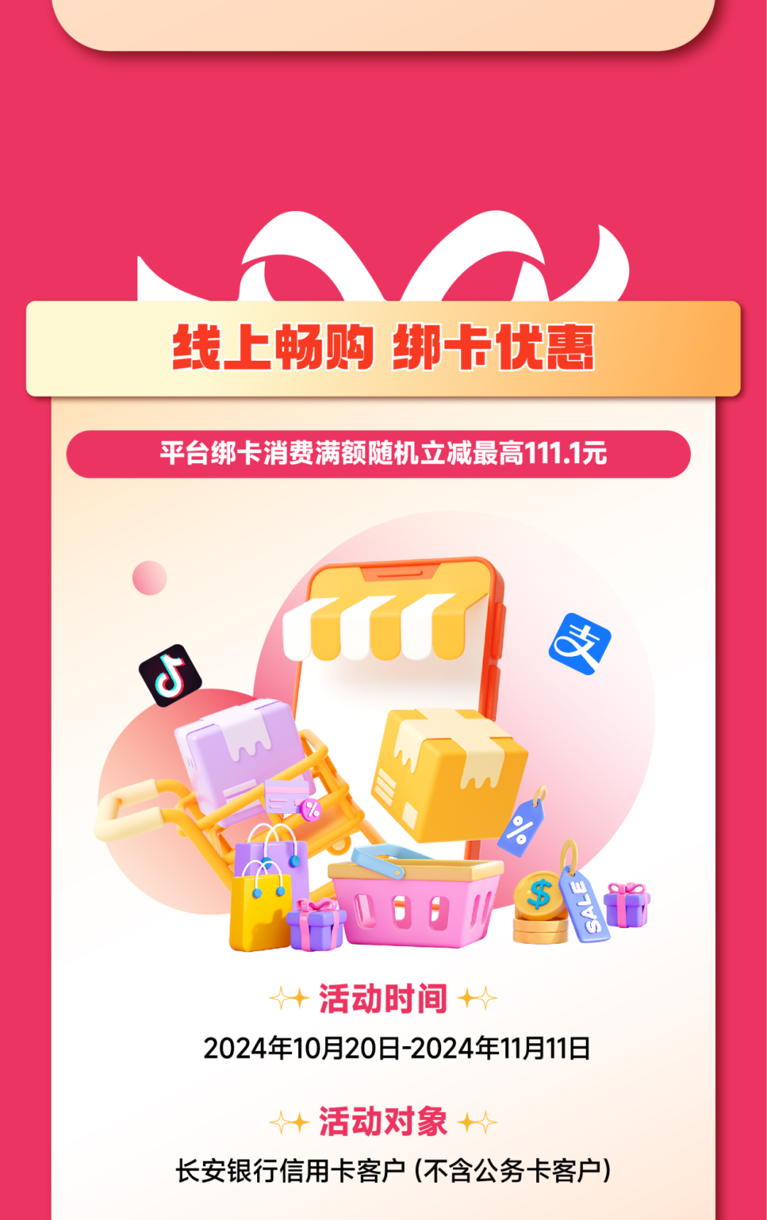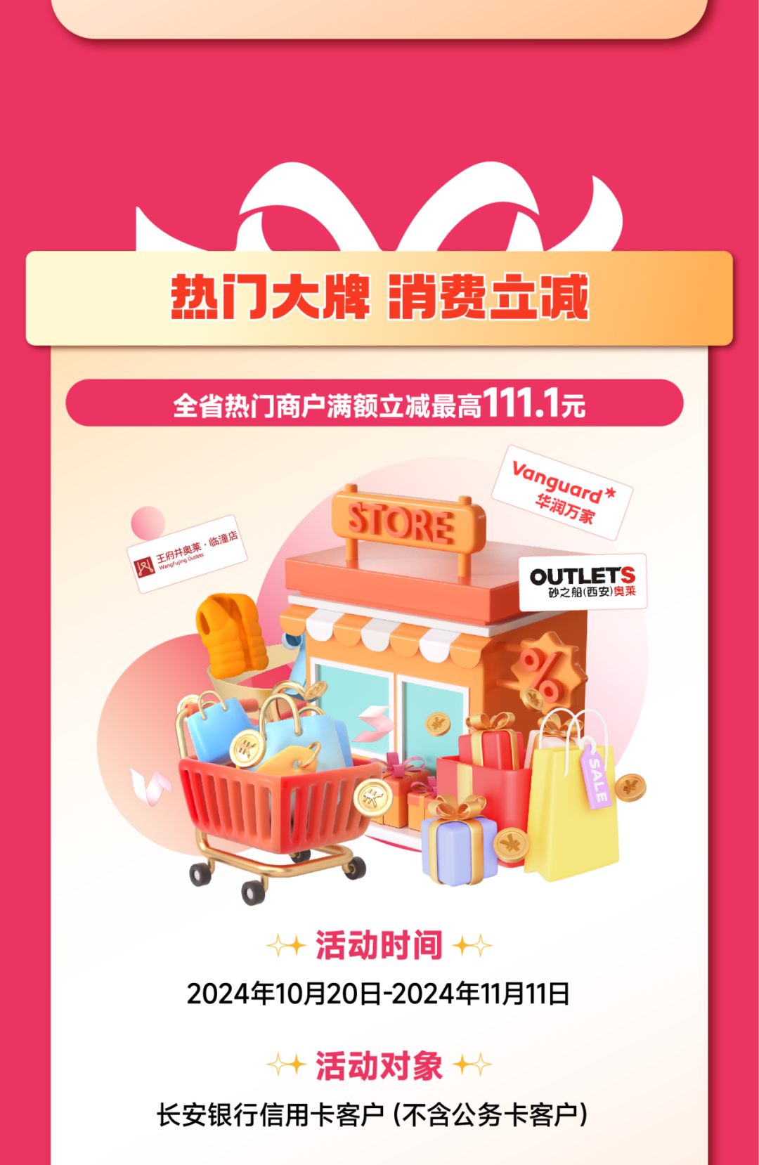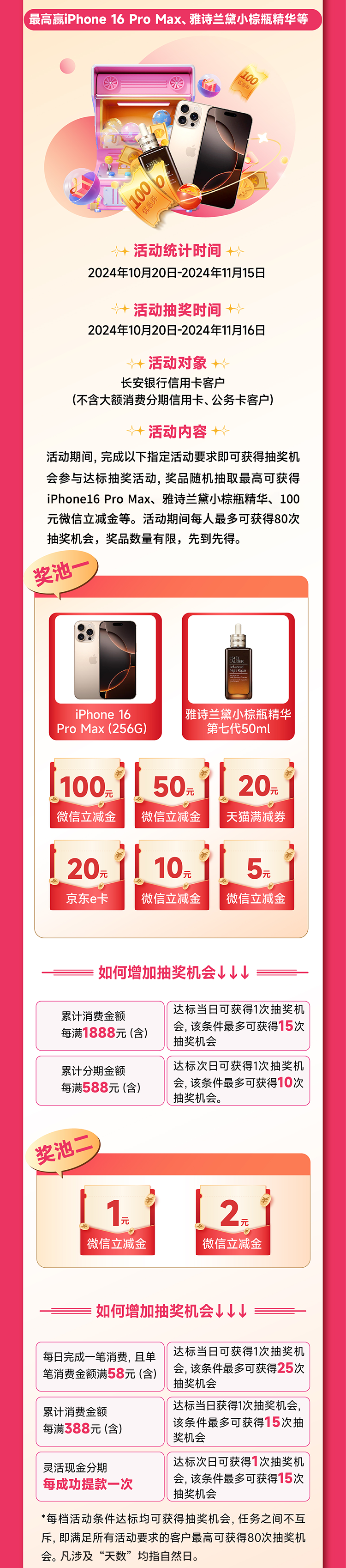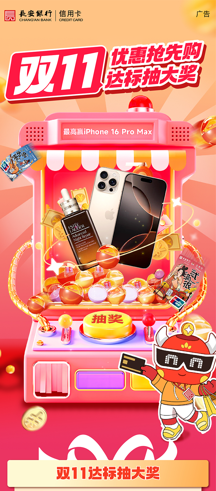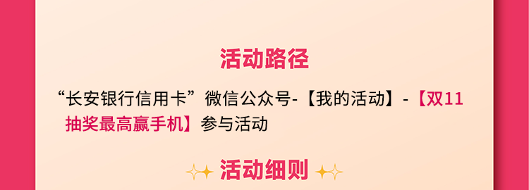 1.账户及卡片状态正常的长安银行信用卡持卡客户均可参与本活动(不含大额消费分期信用卡、公务卡客户),活动期间持卡客户可通过“长安银行信用卡”微信公众号-我的活动-【双11抽奖最高赢手机】参与活动,查看达标进度,符合达标条件后可获得抽奖机会参与活动。