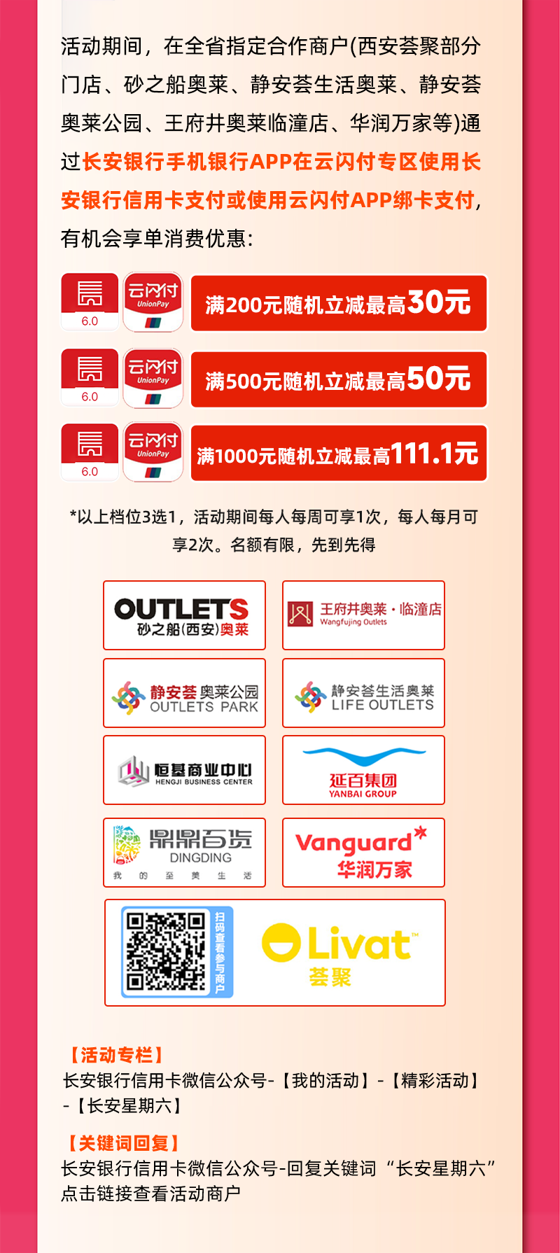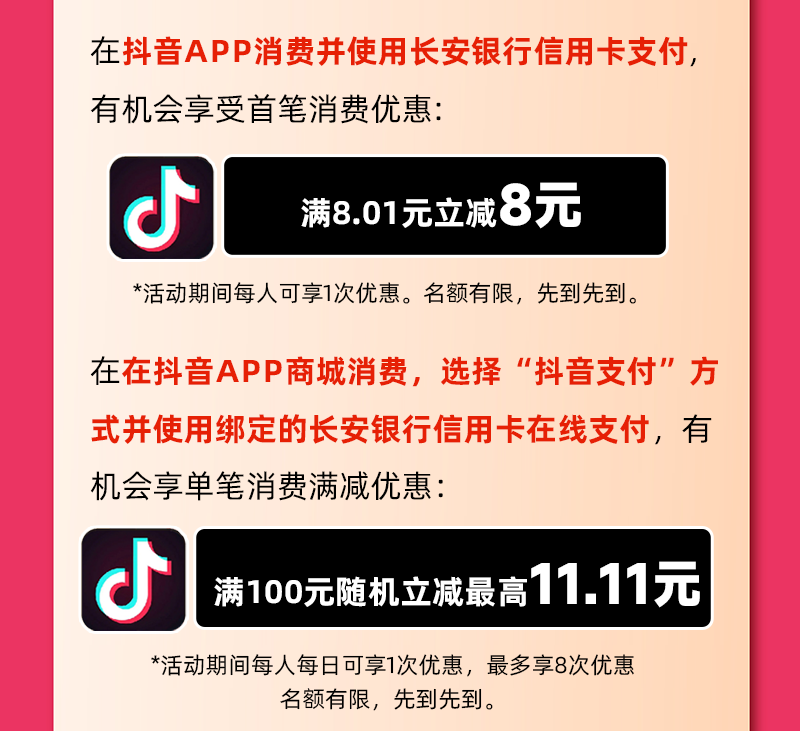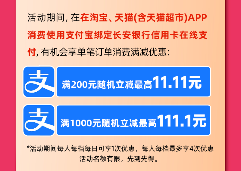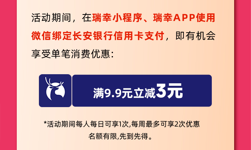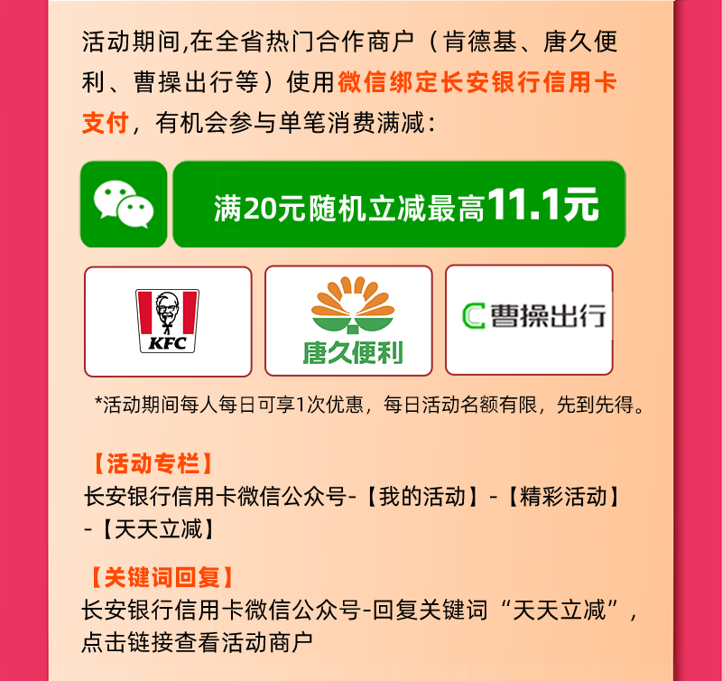 ②使用微信立减金时,持卡客户需使用长安银行信用卡绑定微信支付使用,单笔微信交易限用一张,不可叠加使用。例如:5元微信立减金需满足单笔支付金额大于等于5.01元人民币方可使用。