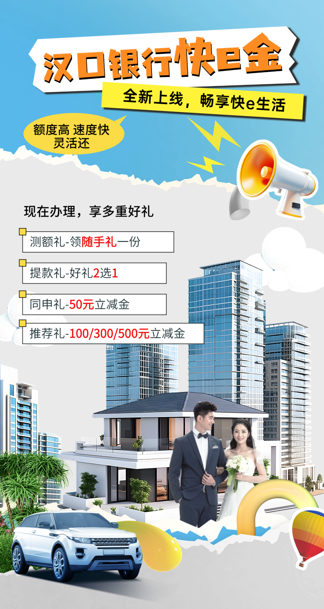 活动期间,通过我行营业网点等渠道办理汉口银行九通信用卡快e贷、快e金产品并成功放款10万元以上(含)的客户办理本行标准信用卡产品,自核卡日起30天(含)内可领取价值50元的微信支付立减金1份。