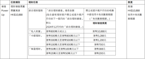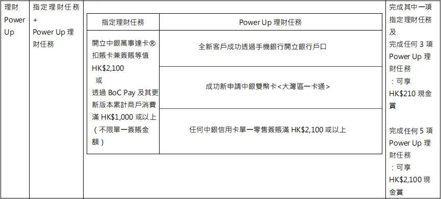 · 於登記期內經中銀香港手機銀行「POWER UP 全城賺賞登記頁」(下稱「活動登記頁」)成功登記,並於推廣期內完成以下任何一項 PowerUp 任務「增值 Power Up」、「理財 Power Up」或「消費 Power Up」之指定理財任務 (下稱「合資格客戶」),可享高達 HK$10,888信用卡免找數簽賬額及/或高達 HK$2,100 現金奬賞及/或 2,100,000 中銀信用卡積分︰