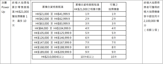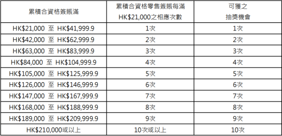 · 推廣期內,憑已登記之中銀信用卡累積合資格零售簽賬每滿 HK$21,000(不限單一簽賬金額),可獲 1 次抽獎機會,合共最多可獲 10 次抽獎機會: