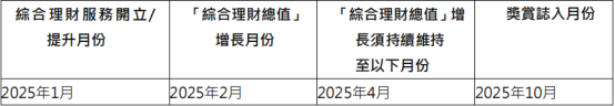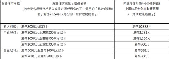 ii. 合資格理財客戶開立或提升賬戶月份的下一個月所達的「綜合理財總值」增長金額(指合資格理財客戶開立或提升賬戶月份的下一個月的「綜合理財總值」對比2024年12月份的「綜合理財總值」)達至以下指定金額,並須維持至開立賬戶或提升月份後的第三個月底: