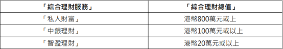 a. 「綜合理財服務」客戶需維持「綜合理財總值」達以下指定金額或以上,以繼續享用相關綜合理財服務的專有服務、利益及優惠。如其「綜合理財總值」低於以下指定金額,中銀香港保留編配客戶至適當級別或撤回客戶「綜合理財服務」及相關專有服務、利益及優惠的酌情權。