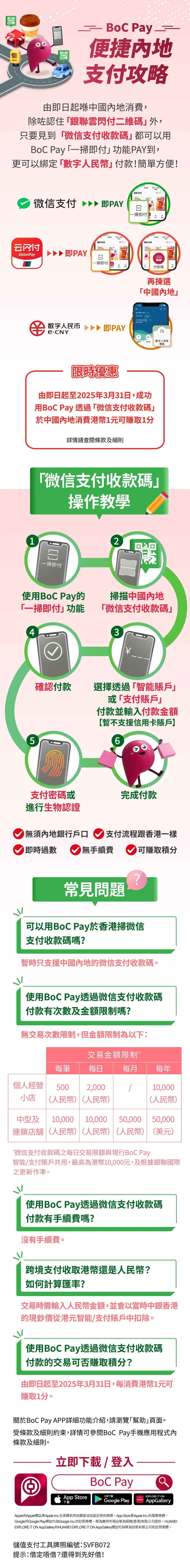 10. 合資格銀行賬戶之客戶每次用BoC Pay透過「微信付款碼」進行交易支付(下稱「合資格銀行賬戶交易」),每滿HK$1或其等值金額可得1積分。如合資格銀行賬戶交易未誌賬或已被誌賬但隨後全部或部份取消、退款或退回,有關交易將可不獲得積分。