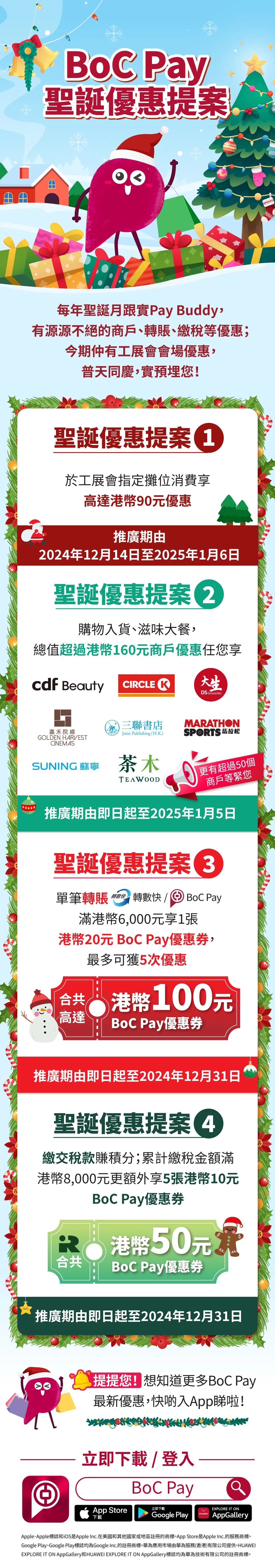 9. 有關「BoC Pay 12月商戶立減優惠」之優惠受條款及細則約束,詳情請瀏覽 www.bochk.com/s/a/bocpayxmas2412 或 BoC Pay流動應用程式。
